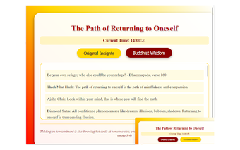 The Path of Returning to Oneself är ett Chrome-tillägg som erbjuder 100 mindfulness-citat för att främja självupptäckte och reflektion. Citat är indelade i två kategorier: Original Insights med 82 citat och Buddhist Wisdom med 18 citat. Användare kan enkelt navigera mellan dessa kategorier via en stilren navigeringsknapp och se citaten i ett scrollbart område. Tillägget har en livlig färgpalett med röd, gul och vit, samt en realtidsklocka för att hålla användarna medvetna om tiden.